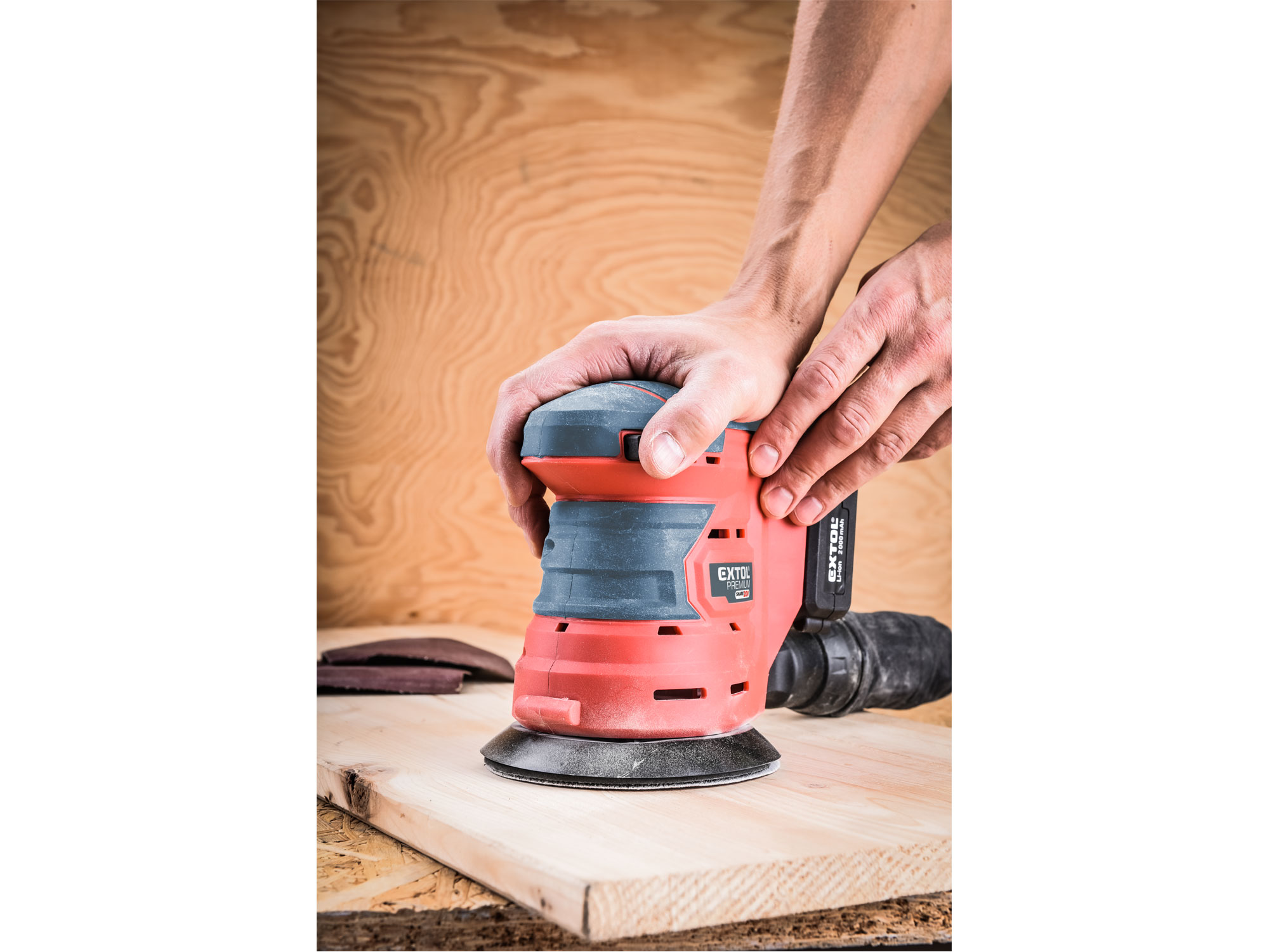 The Extol Premium cordless finishing sander, from the Share20V range, is an ideal tool for sanding wood and metals. Also well suited to removing surface finishes, such as paint and varnish, as well as sealants, etc. without the use of water. The rotary motion creates a high sanding power and the eccentricity creates a random motion that prevents unwanted deep scratches in the material.