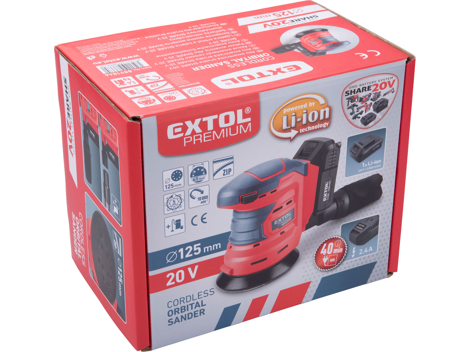For normal work, one or two 2000mAh batteries are enough, these can quickly charge in the supplied quick charger. For more demanding or longer work, we recommend larger batteries with a capacity of 4000mAh. The battery can be used in all types of tools of the EXTOL SHARE20V series. Thanks to the Li-ion technology used, it can be recharged at any time without reducing its capacity. The Li-ion battery has minimal self-discharge and lasts a long time when charged and ready for use.