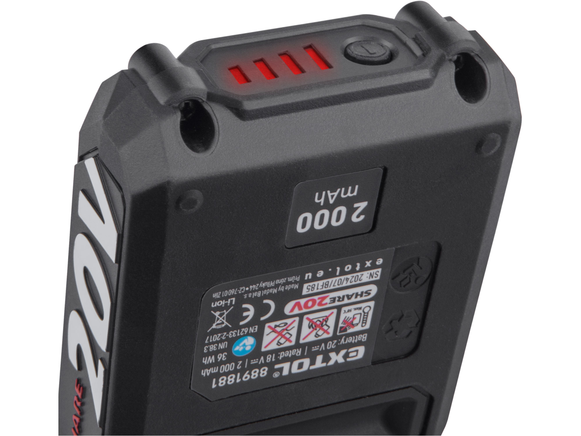 The Extol 20V Li-ion, 2000mAh battery fits any of the Share20V cordless tool range.