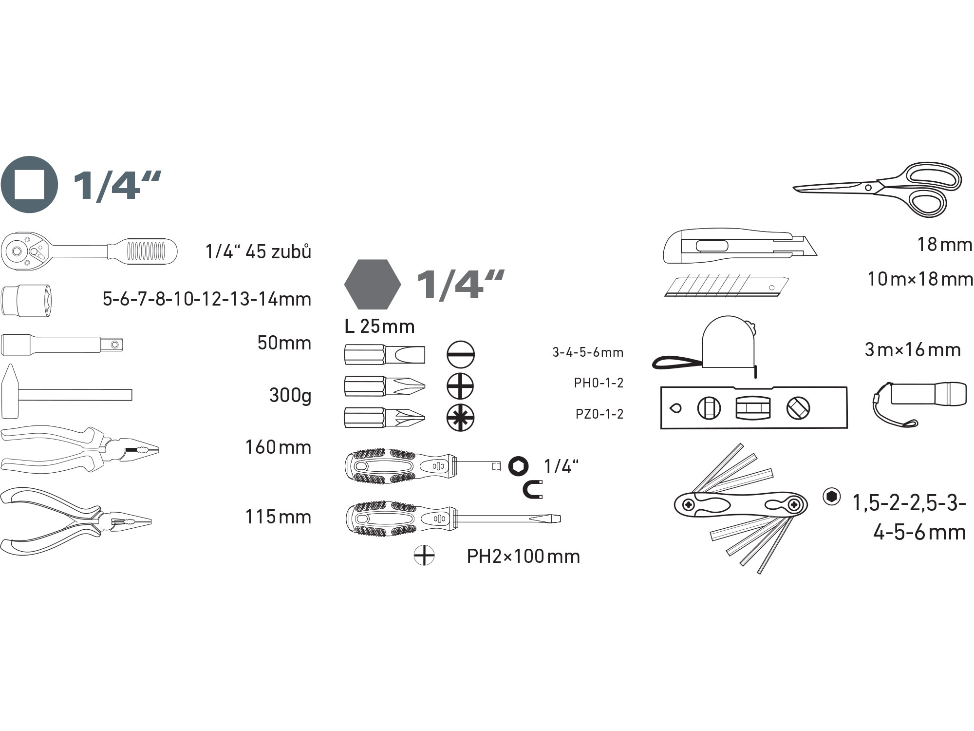 bits: 1/4"(L25mm): (-)3-4-5-6mm, PH0-1-2, PZ0-1-2