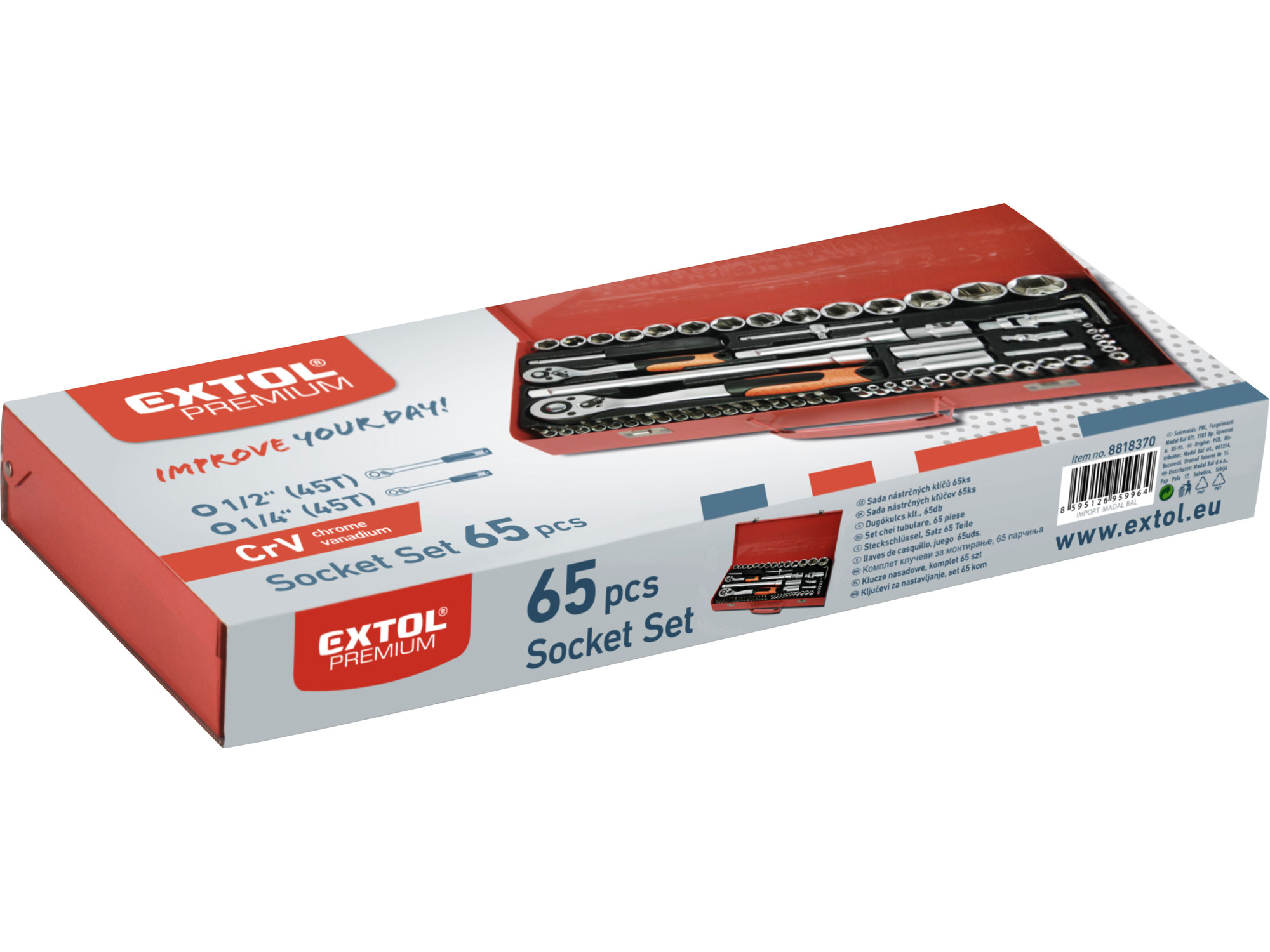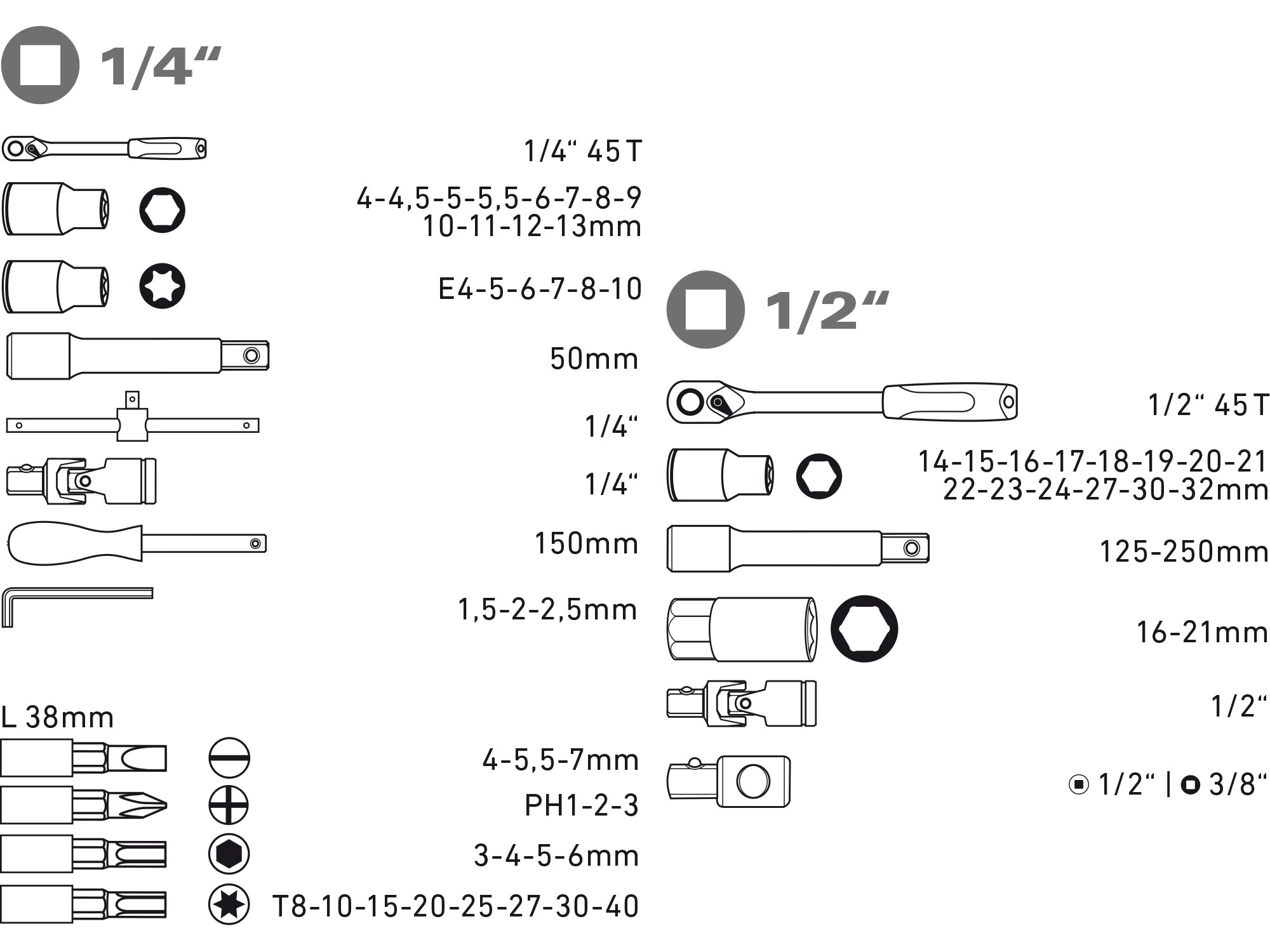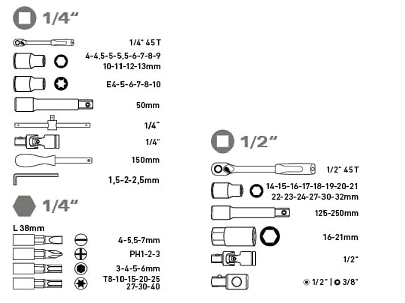 socket heads: 1/4": 4-4,5-5-5,5-6-7-8-9-10-11-12-13mm, E4-5-6-7-8-10, 1/2": 14-15-16-17-18-19-20-21-22-23-24-27-30-32mm