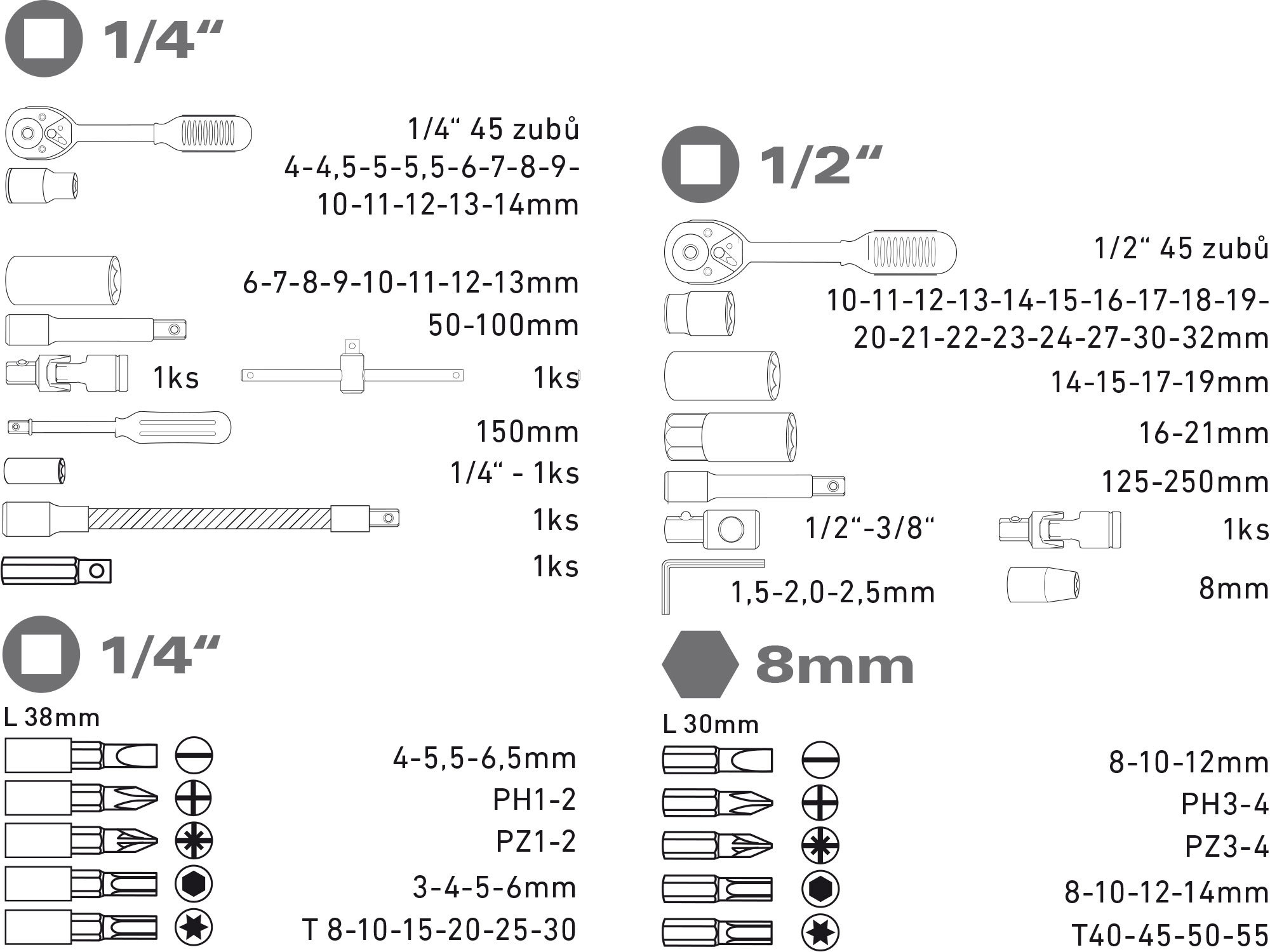 socket heads: 1/4": 4-4,5-5-5,5-6-7-8-9-10-11-12-13-14mm, 1/2": 10-11-12-13-14-15-16-17-18-19-20-21-22-23-24-27-30-32mm
