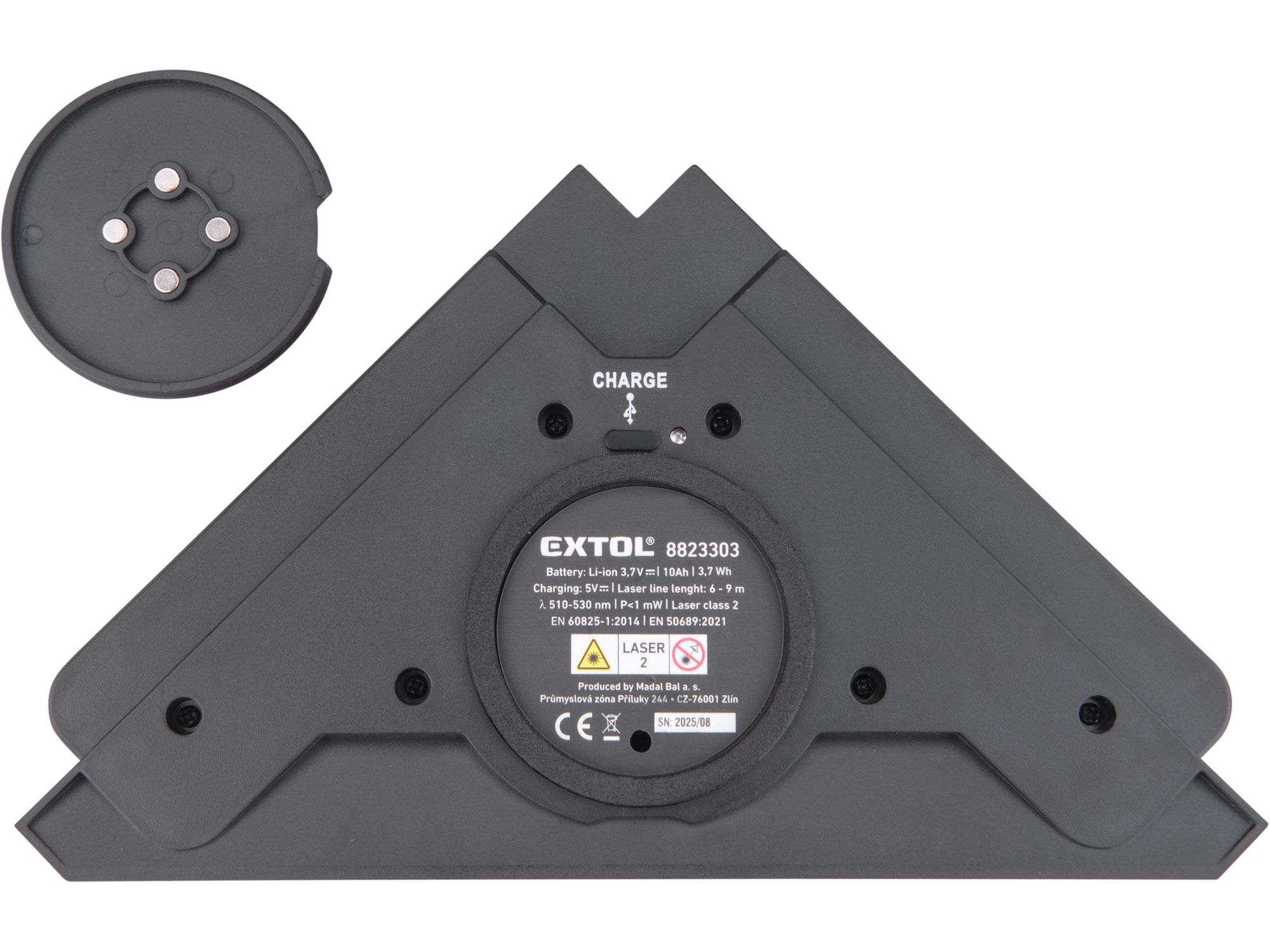 • This cross line laser device is equipped with a built in vacuum suction pump which pulls approx. 2 l/min. A fully charged device in working mode (with both laser lines switched on) can adhere to a non-porous surface for up to 3 hours; without the suction pump switched on, a fully charged device (with both lines switched on) can work for a maximum of 7 hours.