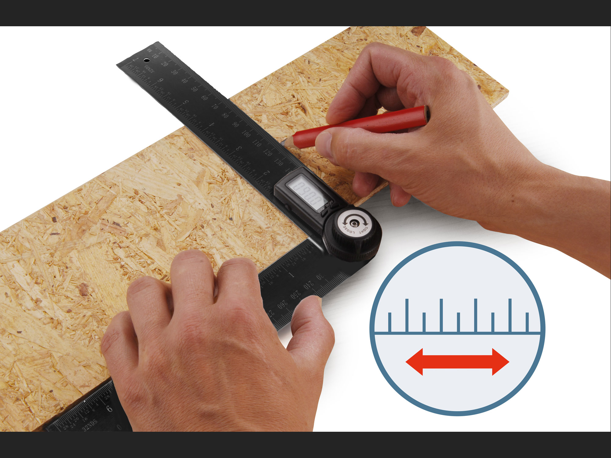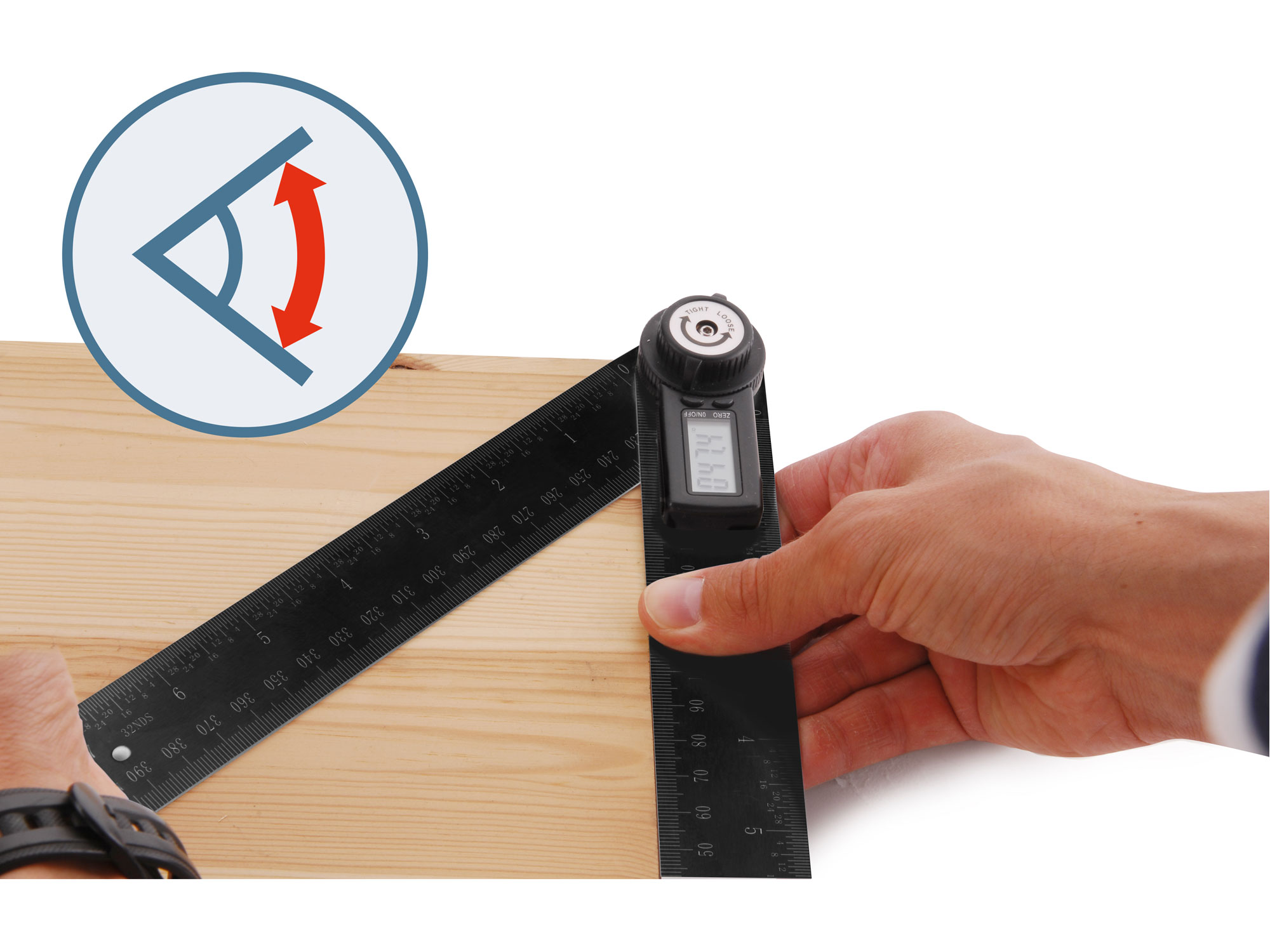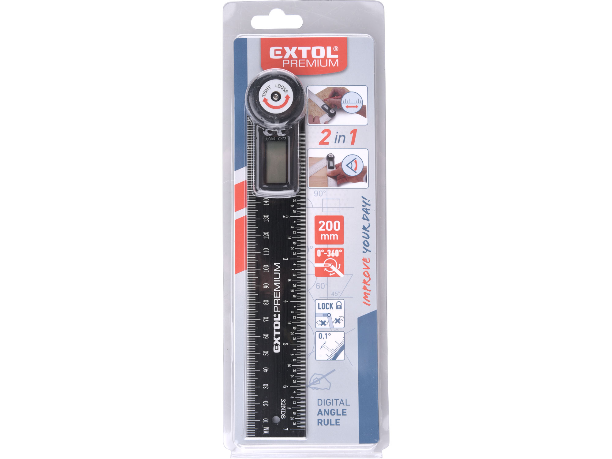 additional parameter: angle measuring range 0 ° -360 °, accuracy ± 0.3 °, resolution 0.1 °, ruler 200mmx35mm, LCD display, battery 3V type CR2032